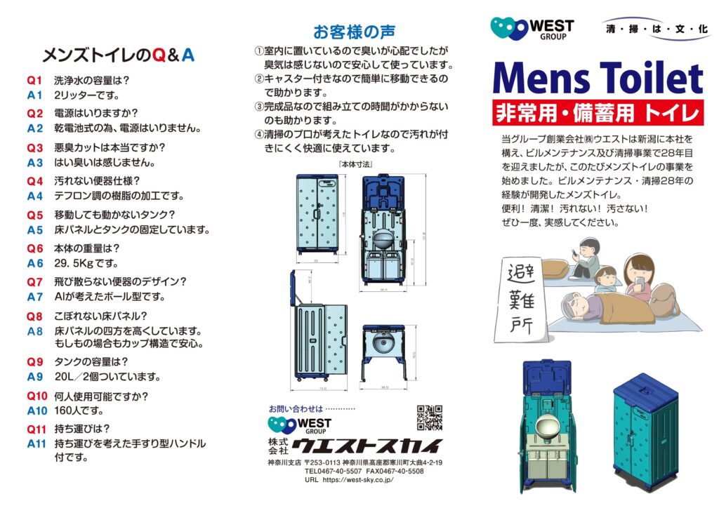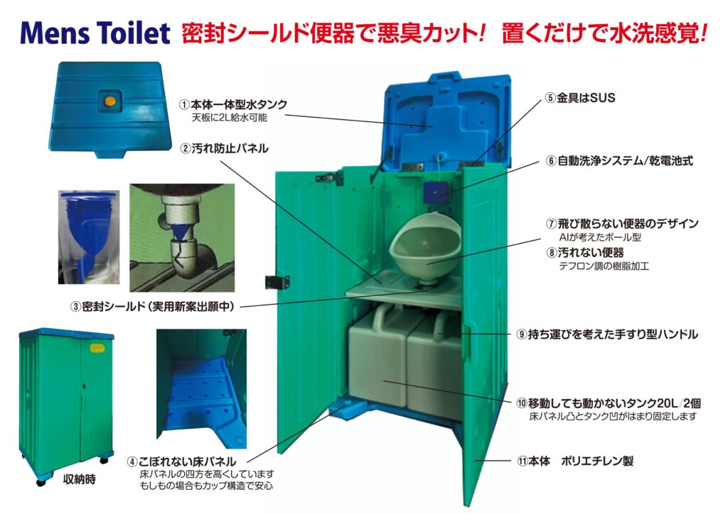 衛生環境を確保することを目的とした 男性専用「非常用・備蓄用メンズトイレ」 の製品化を進めており、